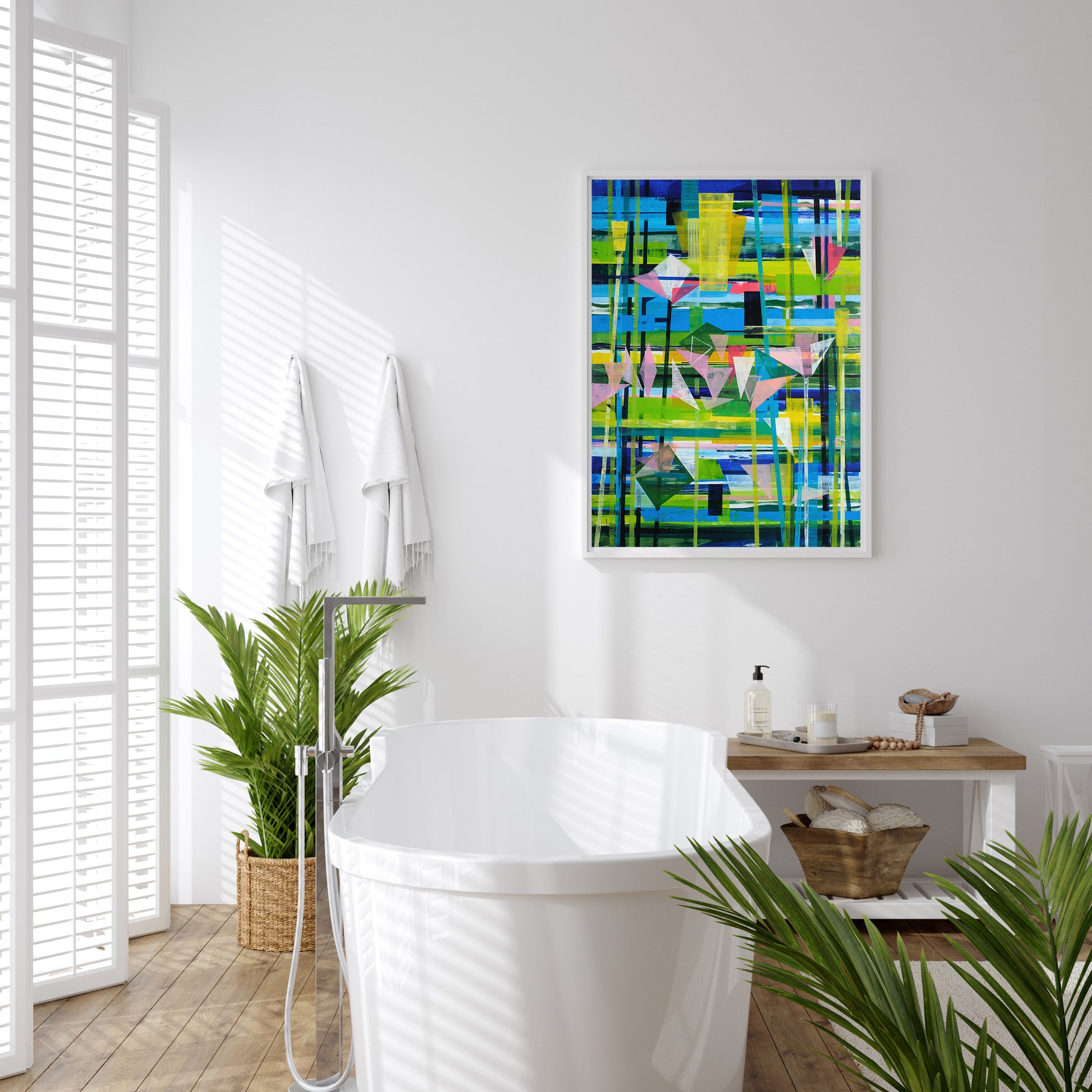 "Where Wind and Water Dance" is a whimsical painting from the Ahoy series, drawing inspiration from water lilies and a gentle summer breeze. With its bold and vibrant colors, paired with simple graphic shapes and textured acrylic paint on a cradled wood panel, this piece is truly captivating. Dimensions: 22" x 30"
