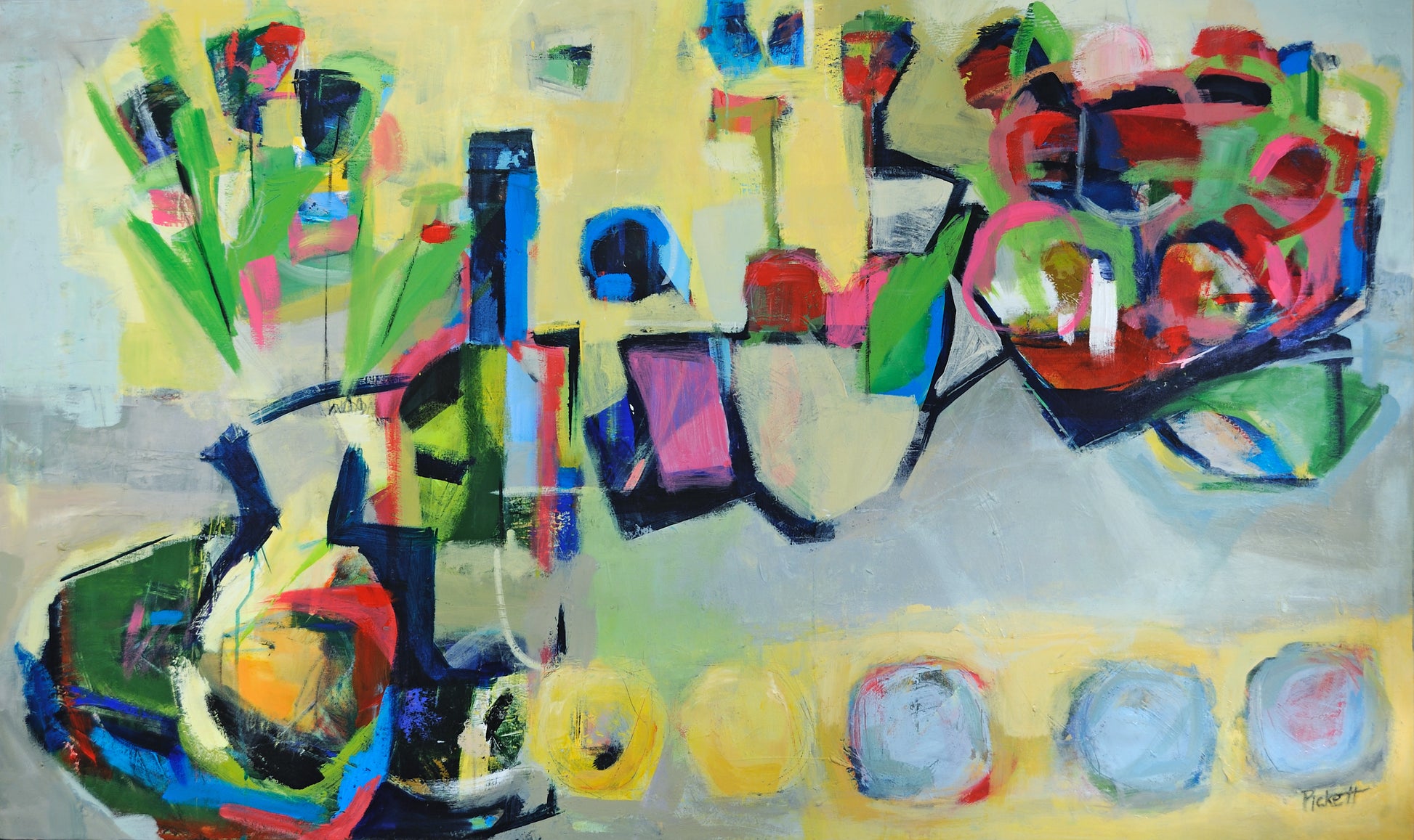 "Garden Party" is a floral table scape. An abundance of nature. Ann Pickett's "Garden Party" exudes a festive atmosphere and all the good things nature has to offer. It is a picnic and you are invited. Bright and vibrant colors, give the artwork a lively and cheerful tone. This painting is originally made in 60" x 48" x 2" dimension, acrylic on canvas.