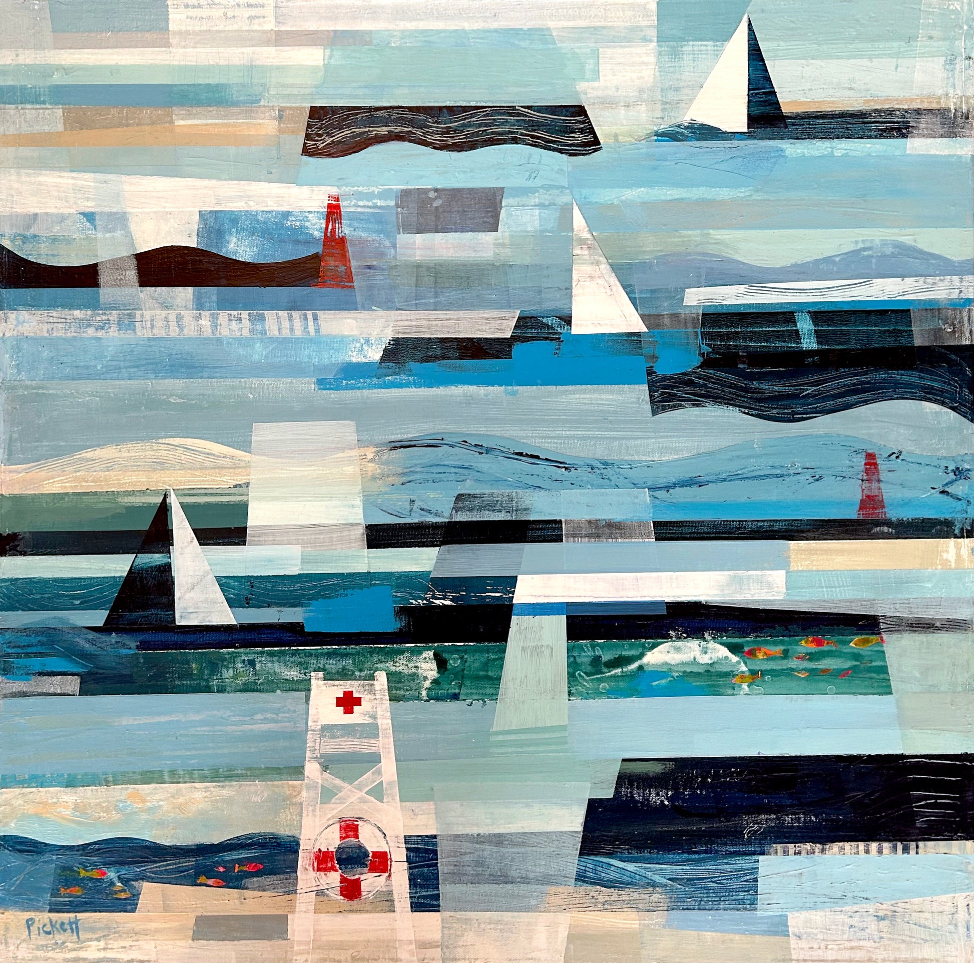 Wind and waves, that is what you will hear as you take in "Guard Off Duty." A serene beach scene with an empty guard chair amid sails and bands of blues. It is a playful but calming nautical theme created in acrylic on canvas. Dimensions 24 x 24 x 2 in.