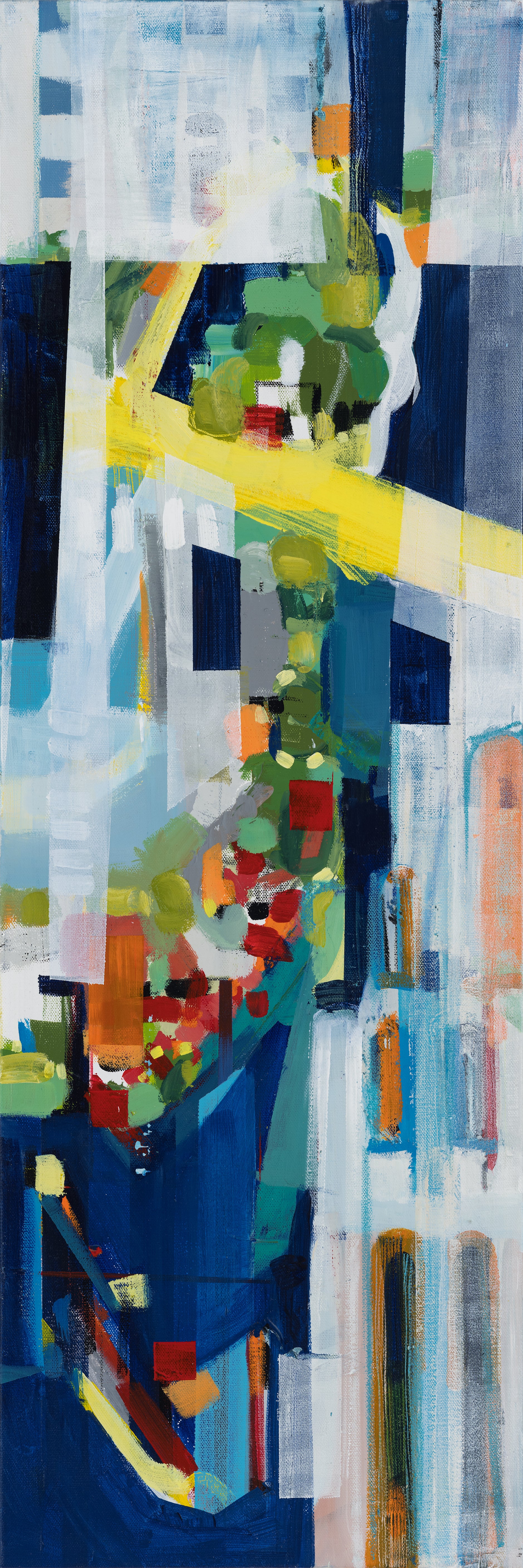 "Elevated Currents: Chicago River Rhythms from 49 Stories" is an abstract work inspired by my view of the Chicago River from my apartment window in daylight. The sun light bouncing off the the glass adding reflections that repeat windows and frame from the Tribune Tower. Acrylic on canvas. Dimensions 12" x 36" x 2" Available as original art and giclee print.