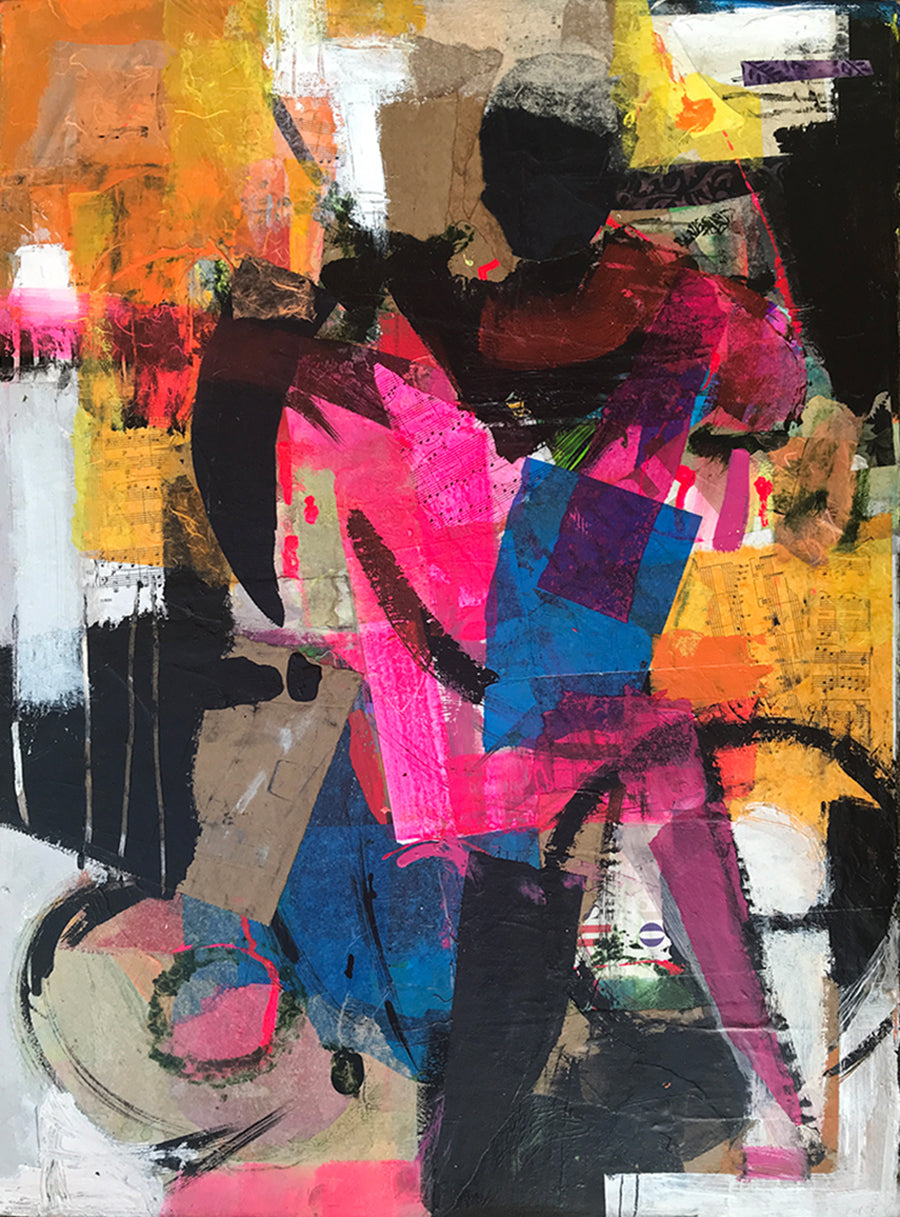 'Soul Cycle" is a bright and vibrant mixed media piece. Tropical colors, pattern and active bold strokes brings this abstract figure to life. Collage and acrylic on deckled edge premium water color paper mounted on a cradle wood panel.