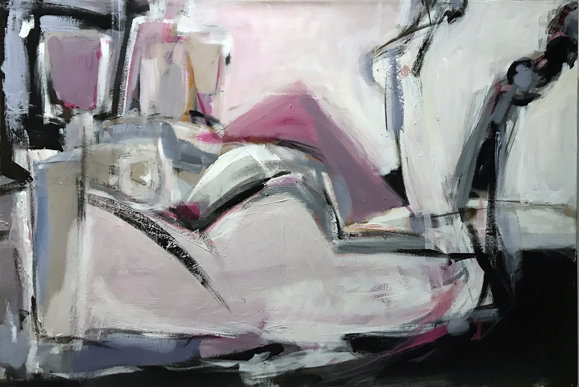 "The Loungers" is a playful abstract suggestive of both figure and landscape. Created in soft grays, purples, pinks with bold contrasting black strokes it is subtle, yet commanding. This painting is acrylic and charcoal on canvas, 36" x 24" dimension.