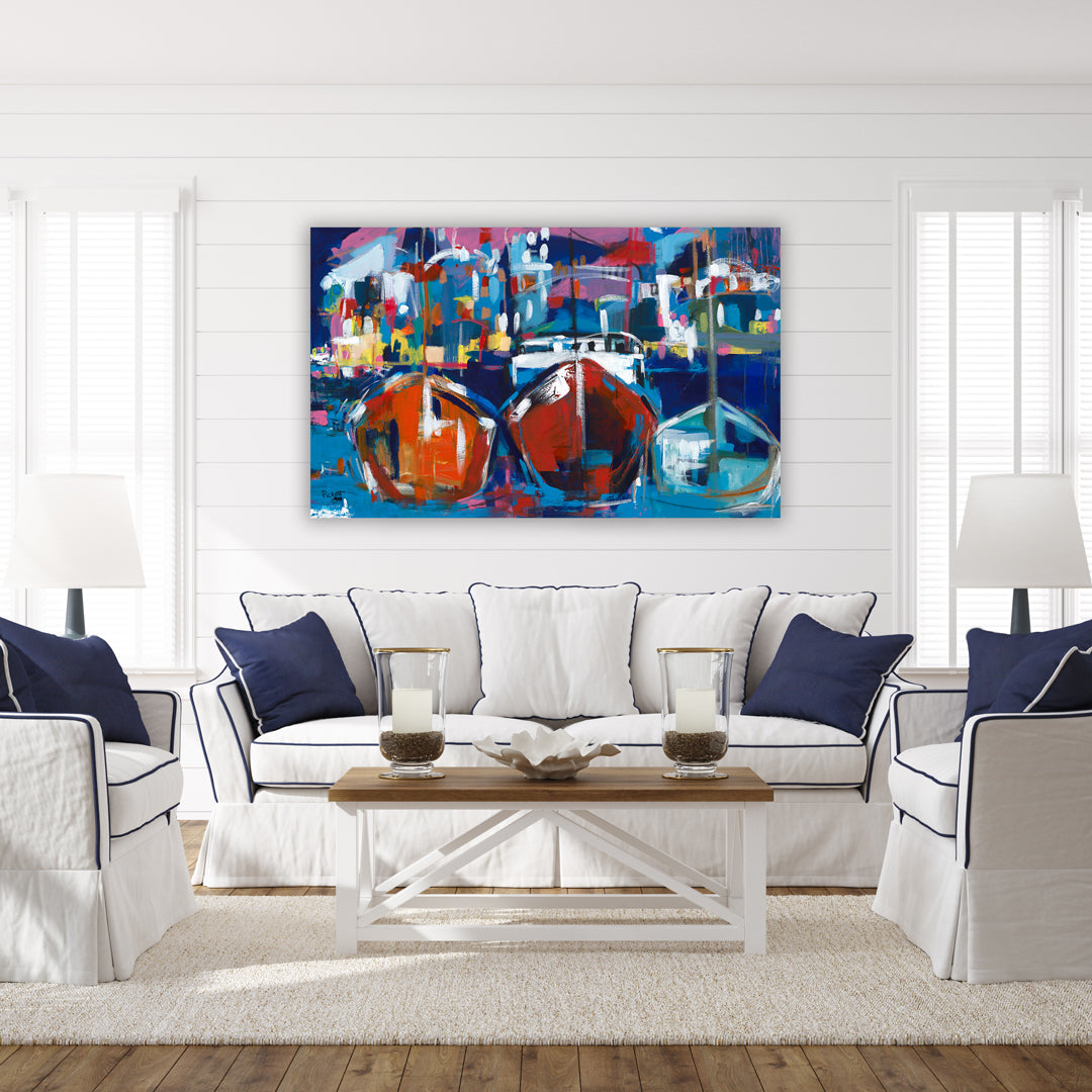 This original acrylic painting depicts a vibrant and festive harbor scene that dances with color and light. Festive colors and dynamic brushstrokes create a sense of movement and energy that brings to life a bustling harbor at twilight.