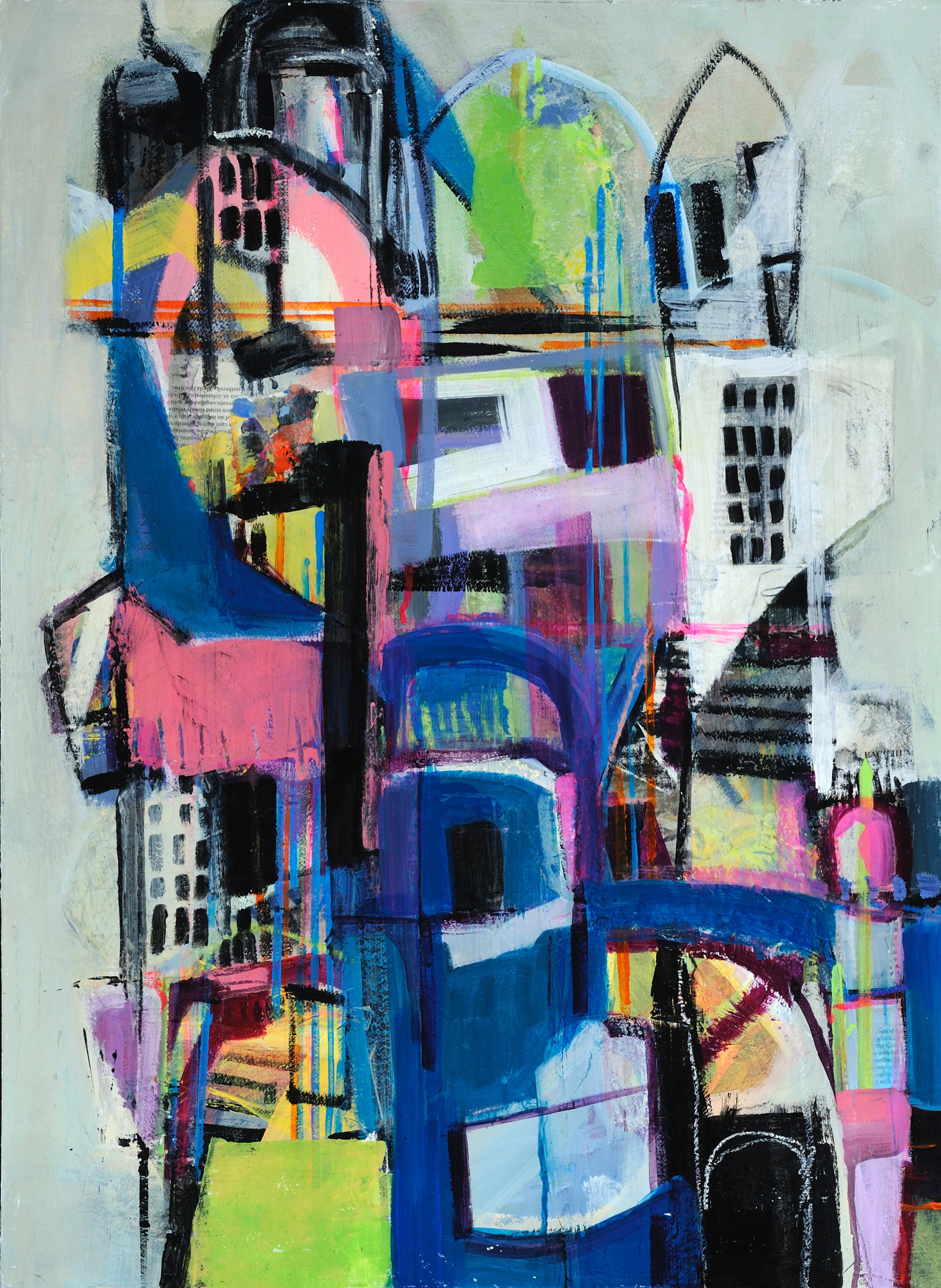 "Village" is a whimsical abstract compilation of doors, windows and architectural structures. With high key colors and bold blacks adds a pop of fun.